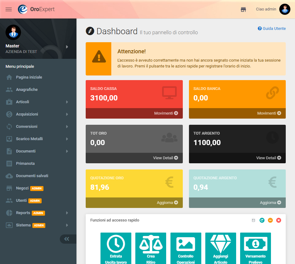 ORO Expert è la soluzione per la gestione completa del compro oro veramente accessibile a tutti sia economicamente che come soluzione tecnologica. Integra strumenti estremamente potenti per poter iniziare a lavorare in pochi minuti!